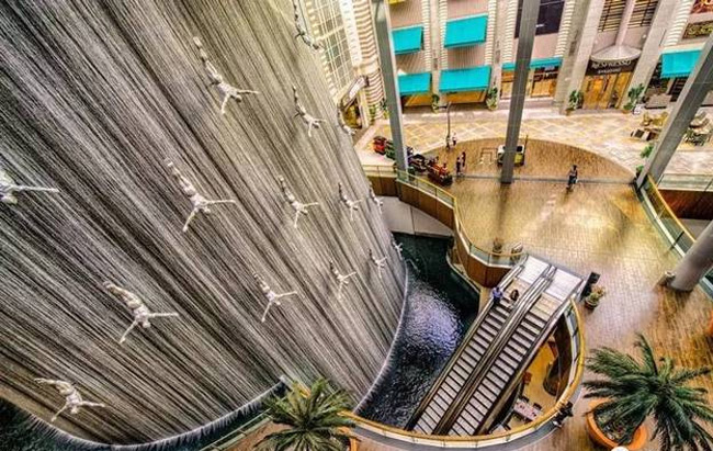 24米高,位于阿拉伯联合酋长国的迪拜购物中心,装饰有潜水员的玻璃纤维雕塑,并穿过室内购物区的四层。(是勇敢呢还是找死呢)
