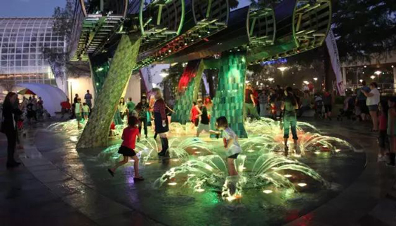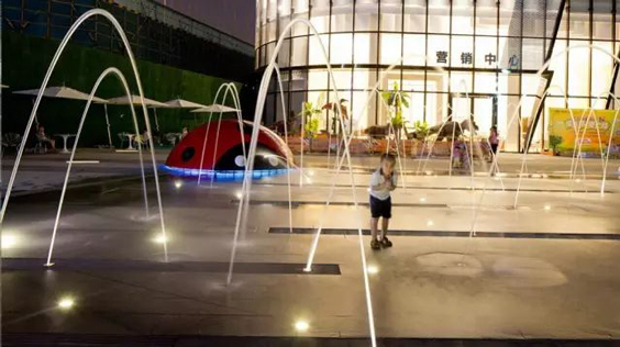 4、旱地喷泉,将喷泉设备放置地下,表面装饰光滑的石材,可以铺设各种图案和造型。喷水时,水柱他通过铺装石材喷出来,在彩灯照射下,地面犹如五颜六色的镜面,将空中飞舞的水花衬托得无比惊艳。停止喷水后,不阻碍交通,可以行人,达到既不占休闲空间又能观赏喷泉的效果。